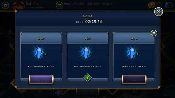 1、任務(wù):在游戲的大廳頁面點擊任務(wù)可以查看每日任務(wù),這里每天會為大家派出三個任務(wù),完成任務(wù)后可以領(lǐng)取到相應(yīng)的寶石獎勵。