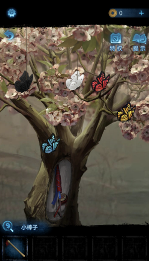 3、在草叢中搜尋找到紙傘,再點(diǎn)擊花叢處的蝴蝶獲得玉蝴蝶,將玉蝴蝶放在碑上。