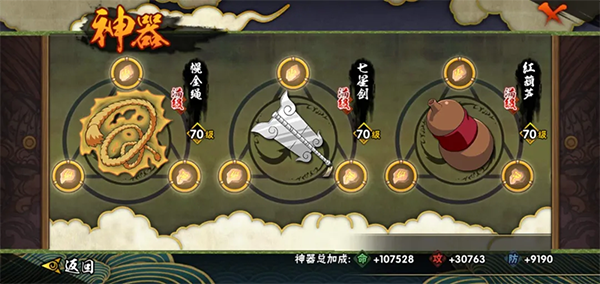 各位學(xué)員每當(dāng)使用忍玉將一個(gè)神器強(qiáng)化至70級(jí)時(shí),另一個(gè)神器便會(huì)解鎖。如下圖所示: