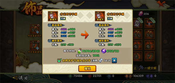 而且在游戲中,飾品與忍具的強(qiáng)化成功對(duì)于戰(zhàn)力提升尤為重要。以飾品為例,在強(qiáng)化時(shí),除了消耗秘術(shù)之塵、秘術(shù)之星這些固定的道具外,還會(huì)消耗保護(hù)符,以提升強(qiáng)化成功率。如下圖所示: