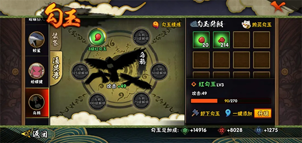 為裝備與通靈獸鑲嵌勾玉,并提升勾玉等級(jí),均可提升戰(zhàn)力。