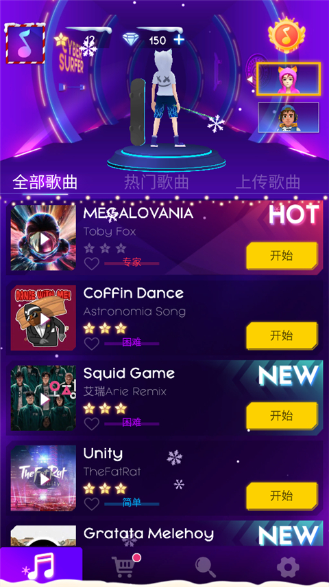 7、返回主頁(yè)面,挑選“全部歌曲”“熱門歌曲”或“上傳歌曲”,自由選擇你最愛的旋律開始挑戰(zhàn);