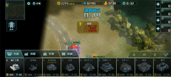 解鎖建筑:施工工地上限1,發(fā)電站,補(bǔ)給中心,兵營(yíng)上限3,突擊車工廠上限1,船塢上限1,基礎(chǔ)防御塔上限2,海上防御塔上限1