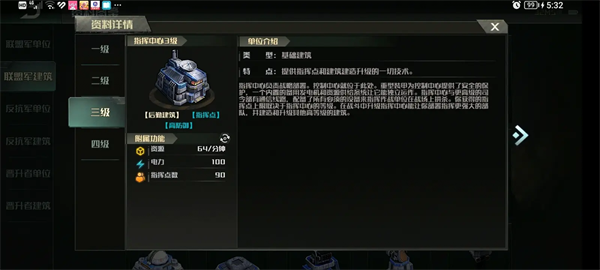 1級(jí):提供:28資源/每分鐘,提供電力57度,提供30點(diǎn)指揮點(diǎn)數(shù)。
