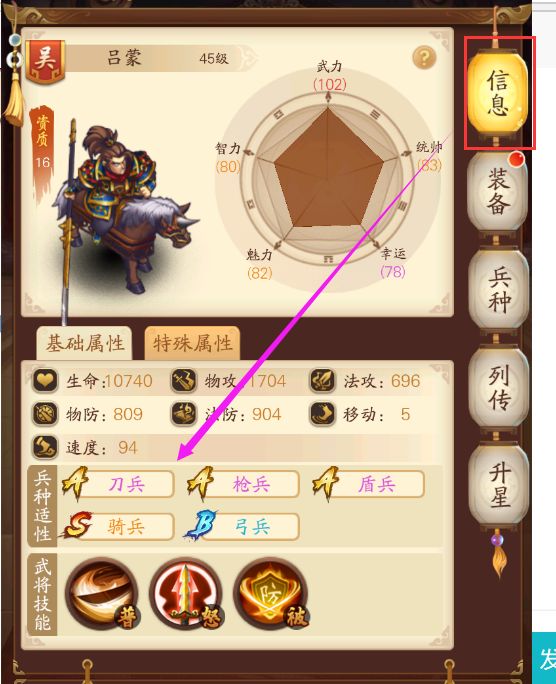 ⑧在角色的信息界面,如下圖所示,可以看該名將的兵種適性,選擇合適的兵種,能發(fā)揮更高的戰(zhàn)斗力。