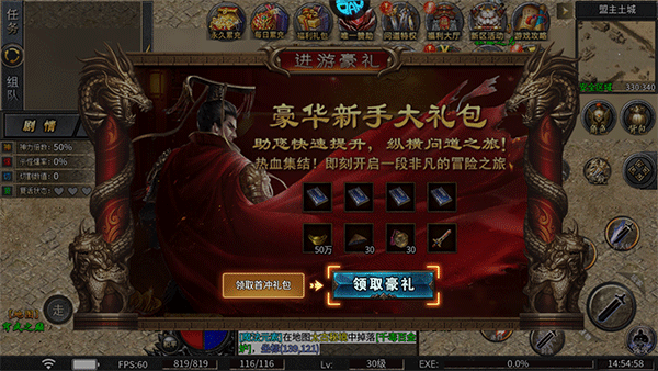 3、首次進入送豪華新手大禮包,助你快速提升,縱橫問道之旅,點擊領(lǐng)取豪禮并進入游戲;