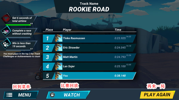 5、這里小編摔了個大跟頭,狗啃泥,得了個倒數(shù)第一。。這里可以看下剛剛的回放,或者快速再來一把!