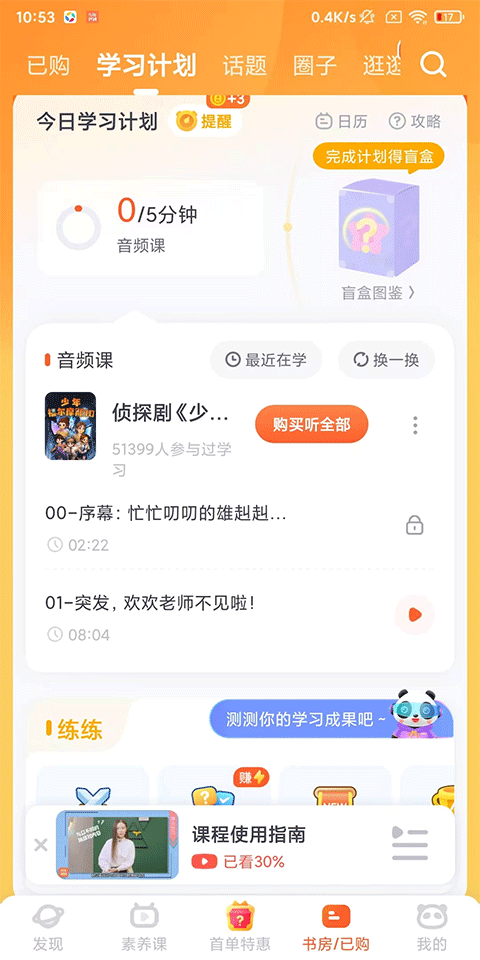 5、購買的課程可以在書房/已購頁中查看,也可以在此頁制定學習計劃,參加話題討論,逛圈子等;