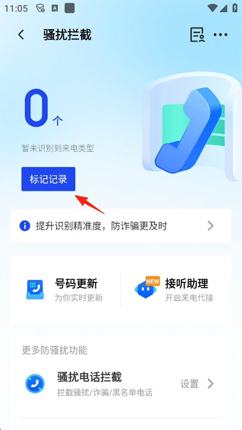 2、在騷擾攔截頁面點(diǎn)擊標(biāo)記記錄按鈕;