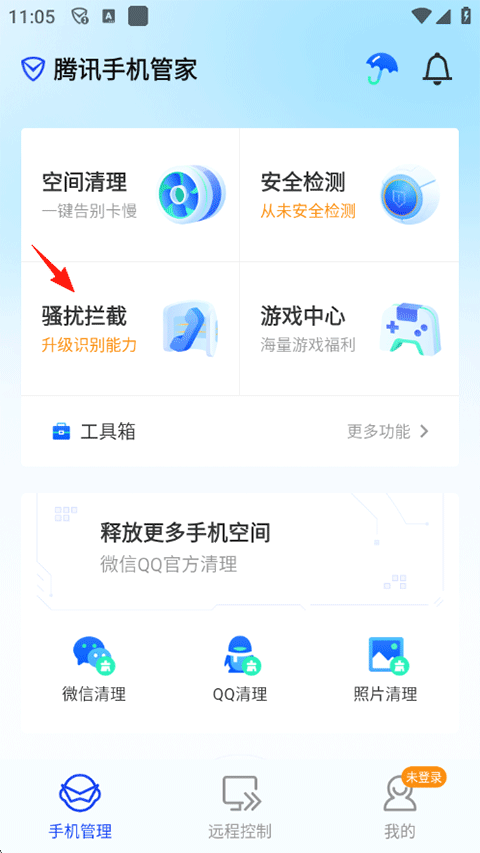 1、打開騰訊手機(jī)管家,點(diǎn)擊下方騷擾攔截;