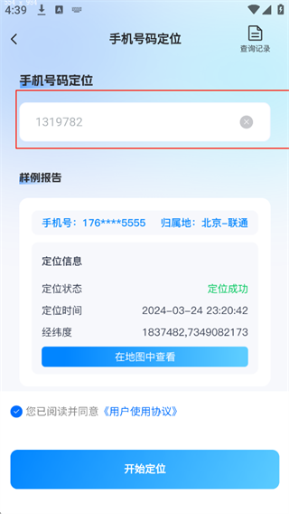 2、輸入手機(jī)號(hào)點(diǎn)擊開始定位