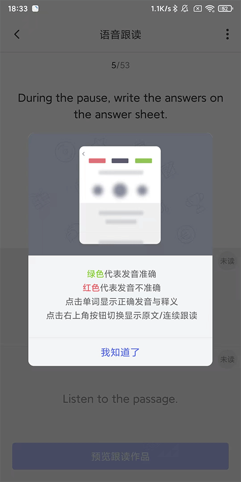 4、綠色代表發(fā)音準(zhǔn)確、紅色代表發(fā)音不準(zhǔn)確,點擊【我知道了】;