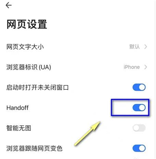 3、進入網(wǎng)頁設置,將handoff后面的開關(guān)打開即可,如下圖所示