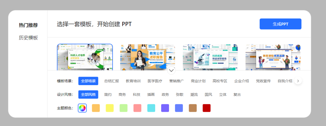 生成完大綱,點(diǎn)擊底部“一鍵生成PPT”,選擇PPT模版。
